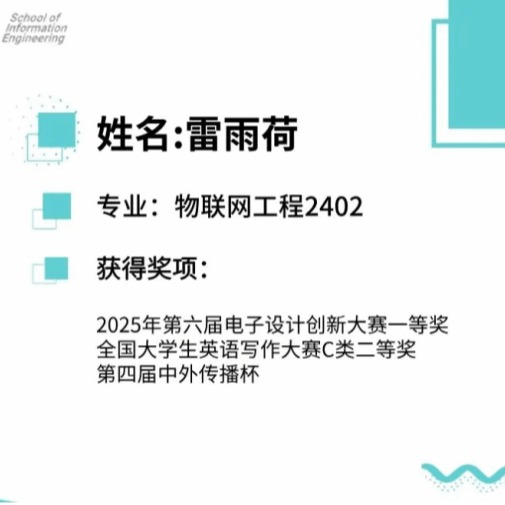 在物联网工程专业的大家庭中,总有一些同学脚踏实地、奋勇争先,在学业、竞赛与实践中不断突破自我,成为大家身边的榜样。今天,我们走近物联网工程2402班雷雨荷同学,听她分享大学一年多来的成长故事。她曾从容主持大一物联网专业开学典礼,在学科竞赛中屡获佳绩,斩获2025年第六届电子设计创新大赛一等奖、第四届“中外传播杯”全国大学生英语写作大赛C类二等奖。从青涩腼腆到自信从容,从默默耕耘到崭露头角,她用坚持与努力,...