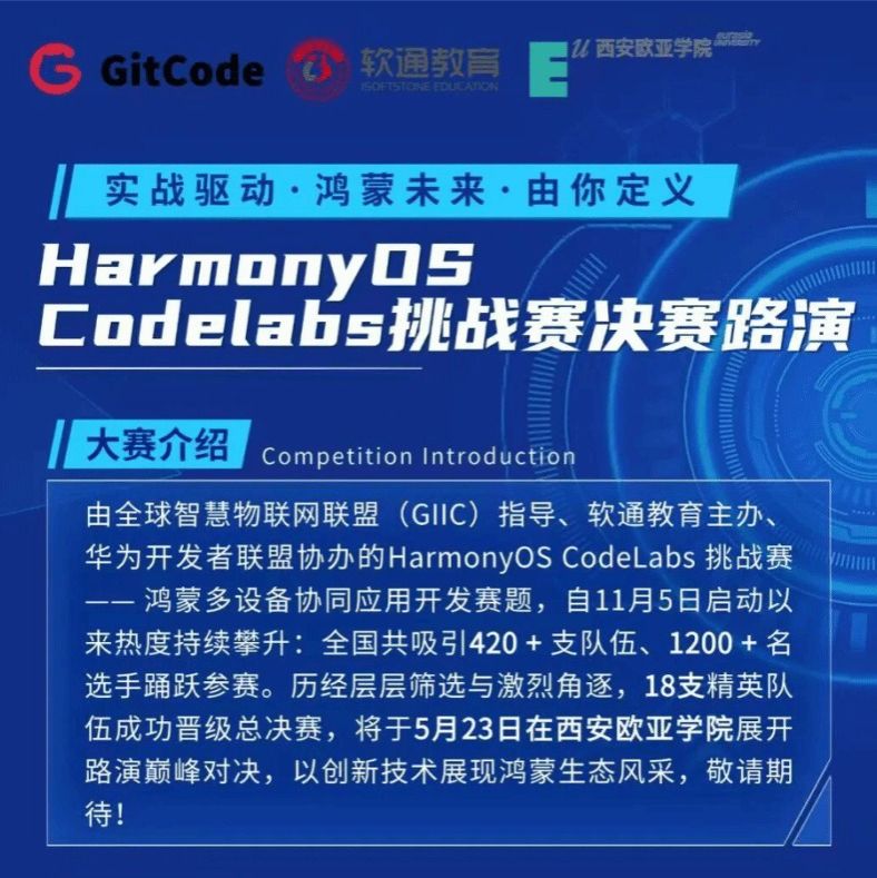 5月23日,HarmonyOS CodeLabs挑战赛决赛路演将在西安欧亚学院开启,18支晋级队伍同台竞技,共展鸿蒙应用开发创新成果。 -END-