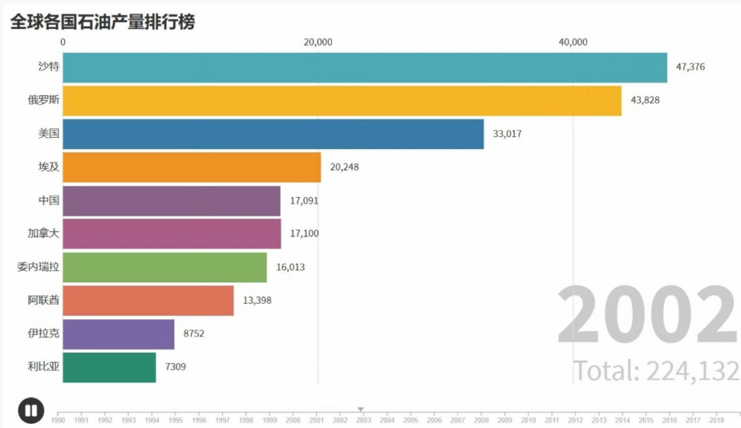 由于现在各种不可再生资源都无比宝贵,而石油更是重要的战略物资,因此我们做了关于近几十年来各个主要石油大国的产量统计,希望可以以此来引起每个人对资源的保护。