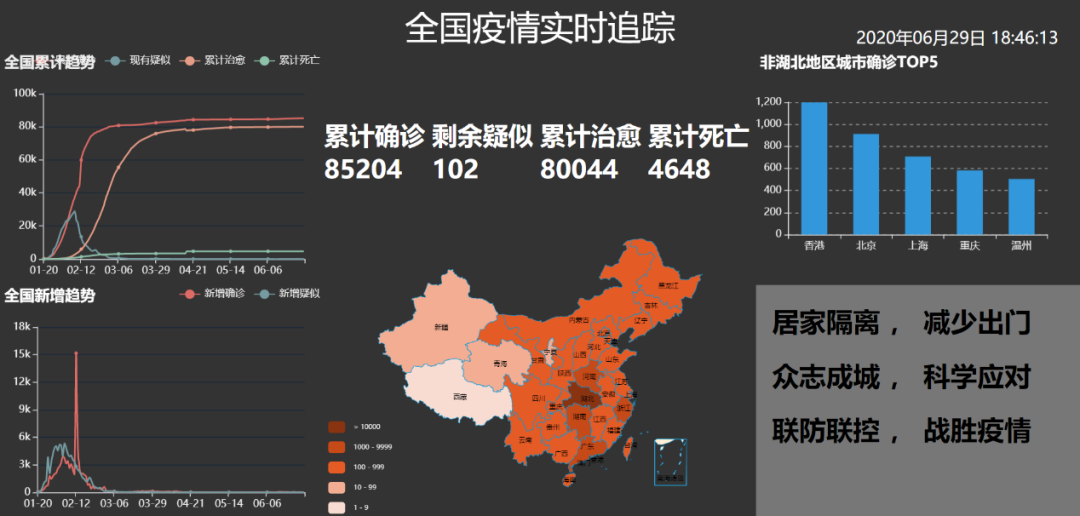 为了实时监测中国疫情的发展趋势,通过对腾讯疫情监控信息的分析以及可视化,可以清晰的看到全国各地患有新冠肺炎患者的人数和全国疫情的整体发展趋势,大家可以更直观的了解我国疫情的发展情况。