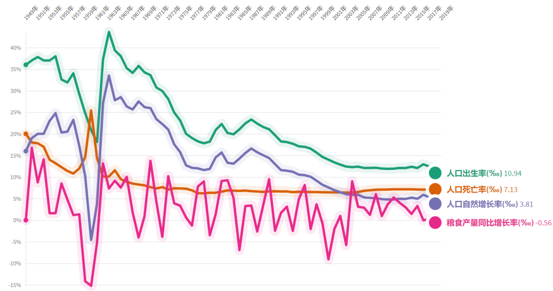 建国以来我国人口出生率、死亡率、自然增长率与粮食产量增长率,在与历史事件相互碰撞后会产生什么呢?由时间来解释。