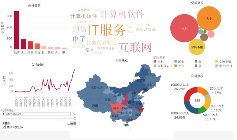 本作品以物联网行业为例,使用python和tableau软件对物联网相关岗位的招聘数据进行处理、分析的基础上,提供多个维度数据的可视化展示,为求职者提供一份相对合理、完整、专业的就业参考。