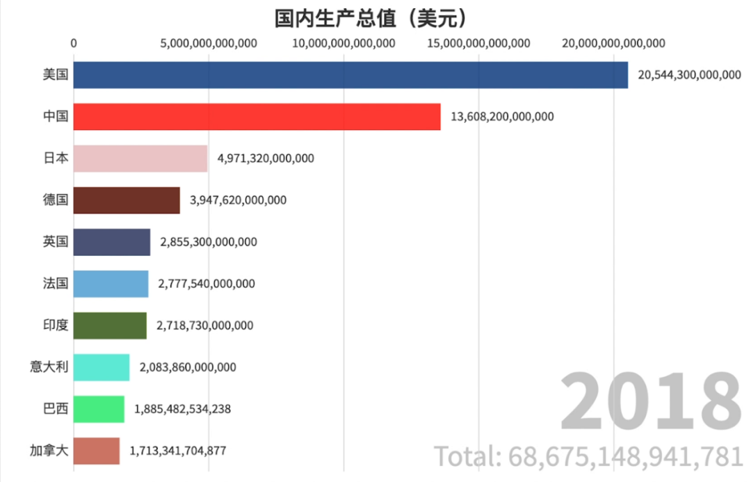 本作品数据源自世界银行的数据,采用全球多个国家的GDP(国内生产总值)数据动态排行,利用Flourish在线数据可视化网站进行数据分析以及可视化,动态演化了中国崛起的全过程。