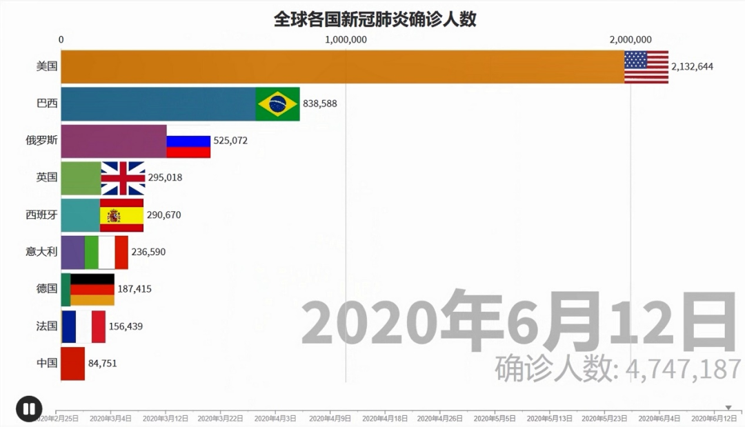 一场突如其来的疫情,给了我们太多猝不及防。正当国内疫情好转之时,新冠疫情却在国外开始蔓延,各国防控疫情形势严峻。本作品用可视化的方式展示了2020年2月25日到6月12日期间全球新冠肺炎累计确诊人数较多的国家的疫情数据。