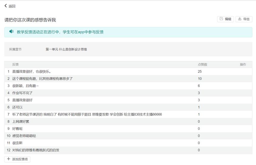 另外反馈必须及时,我会根据反馈结果及时修改课程授课方式和课程进度,针对不同的课程性质,反馈设计可以不同。主观性回答可以参考,但理论课最有效的反馈绝对是测试。
