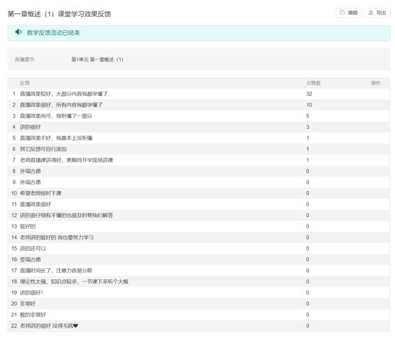 我觉得老师能及时的和我们进行互动和反馈,重点知识也讲的很清楚,有不足的地方就是,建议如果同学提一个观点,老师就稍微回应下就行了,这样就能省点时间。