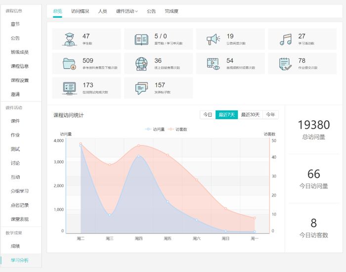 目前,课程进行了两周,从学生回答的情况及测试的结果来看,直播还是达到了预期的教学效果这点从畅课系统上的学习分析数据上也能窥见一斑。以其中一个班的《计算机网络》课程为例,仅仅两周时间,畅课总访问量已接近两万人次。