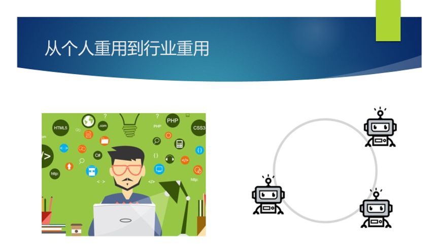 但是重用是没有尽头的,因为明天小李同学可能还会问乘法问题,四则运算问题甚至物理问题,我们也需要根据需求的不断升级,不同的抽象出更高阶的规则,做好了这些每个程序员都能沉淀下来一些基础库,一些工具链用来处理之前没有抽象到的新需求。但是,再重复一遍,好的程序员是很懒惰的,所以他们把自己的代码,也就是前面我们说的机器人放到网络上分享给其他人,还发起了声势浩大又影响深远的开源运动,我们几乎找不到第二个行业能如此开放,如此毫无保留、如此大规模的共享行业的知识与成果。