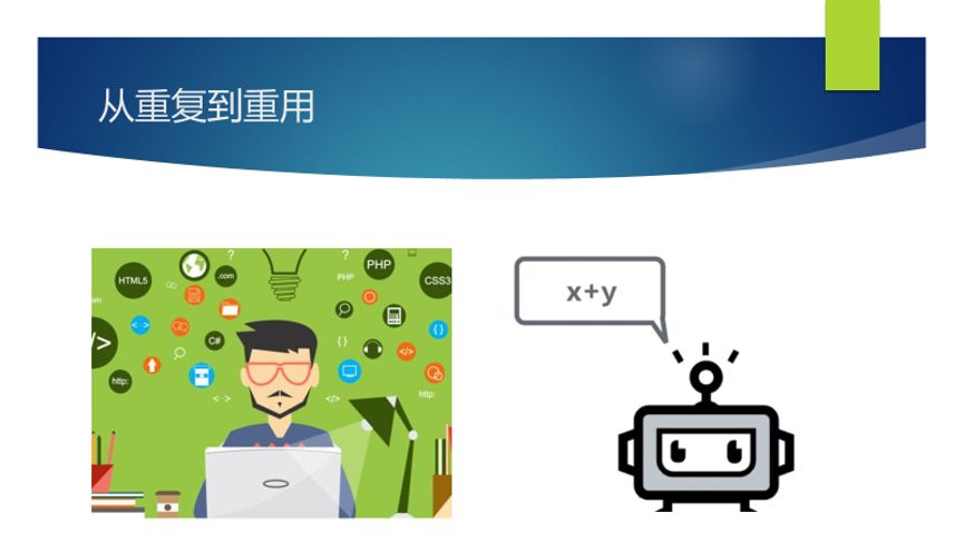 于是当小李同学有了成长,开始问二加二等于几时,我们之前的机器人就不够用了,我们需要做一个专门发送四的机器人。随着小李同学的问题越来越多,我们要做的机器人也越来越多,最后我们终于忍不住了,为了偷懒我们做了一个加法机器人,只要小李同学问的是加法问题,这个机器人都能处理,他会自己从问题中抽取加数和被加数,然后发送结果,他也不再定时发送,而是实时响应问题,这就是重用。