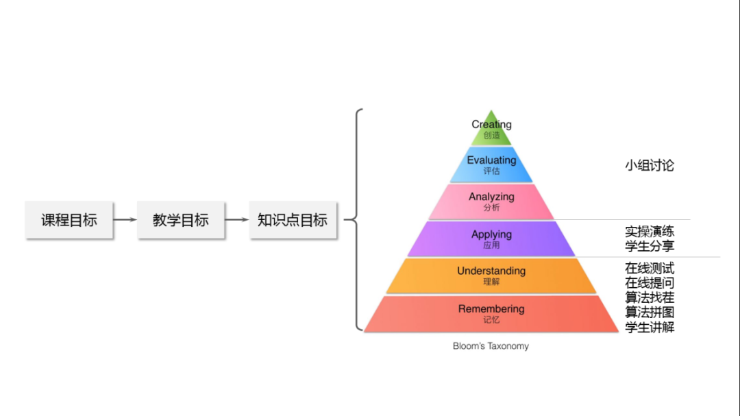 一场突如其来的疫情,让教学方式由面授改为直播,作为新晋女主播必须直面这一切,因此根据直播的特点在教学设计中增加了很多互动环节,我首先根据课程目标分解出每节课的教学目标,然后分解出知识点目标,最后根据布鲁姆的目标分类进行互动环节的设计。