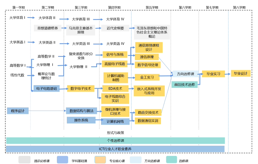 专业遵循国标要求,基于OBE理念,构建了“大平台、微方向”的课程体系,方便根据产业发展及市场人才需求灵活、敏捷迭代专业方向,符合信息通信领域的快速发展需求。