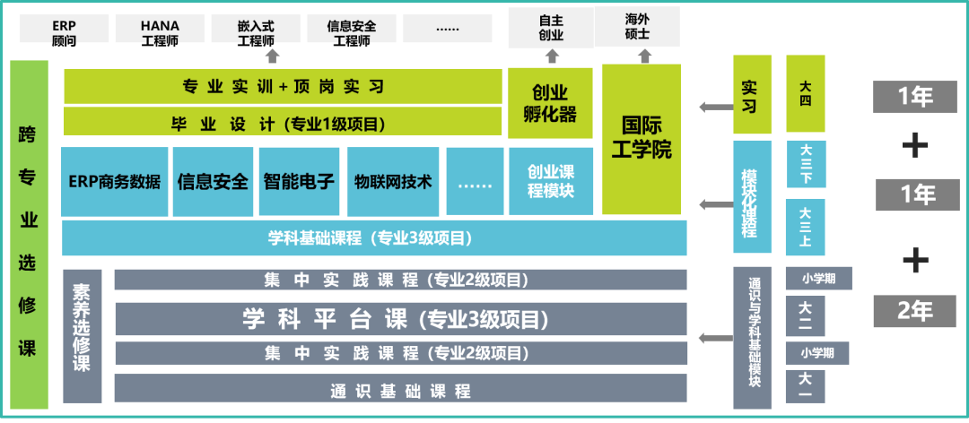 我们在培养符合目标的人才标准下,构建了校企融合的“2+1+1”的人才培养模式,即前两年打通平台课,实施大类培养,夯实专业基础。第三年学生可根据兴趣选择进入专业方向,进行小班制的精细化培养,同时有4个专业与9个专业方向可供选择。最后一年与企业开展工学交替和轮转式的“项目制”培养与3-6个月顶岗实习,强化学生的工程实践能力的培养,着重培养学生“解决问题的能力”的核心能力。