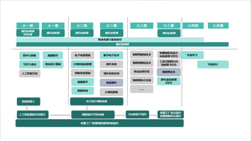人工智能引论、程序设计基础、电子电路基础、数据结构、计算机网络、操作系统、操作系统实训、离散数学、计算机组成原理、数字电子技术、智能硬件、物联网感知技术、物联网通信技术、数据库系统与应用、大数据分析及可视化、物联网应用开发、物联网安全、路由交换技术、Python安全开发、物联网综合实训(多场景物联网系统开发)。