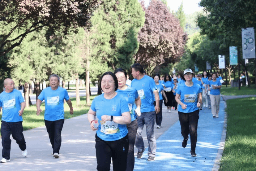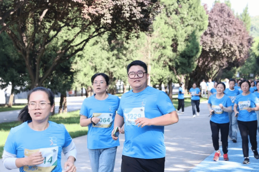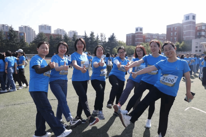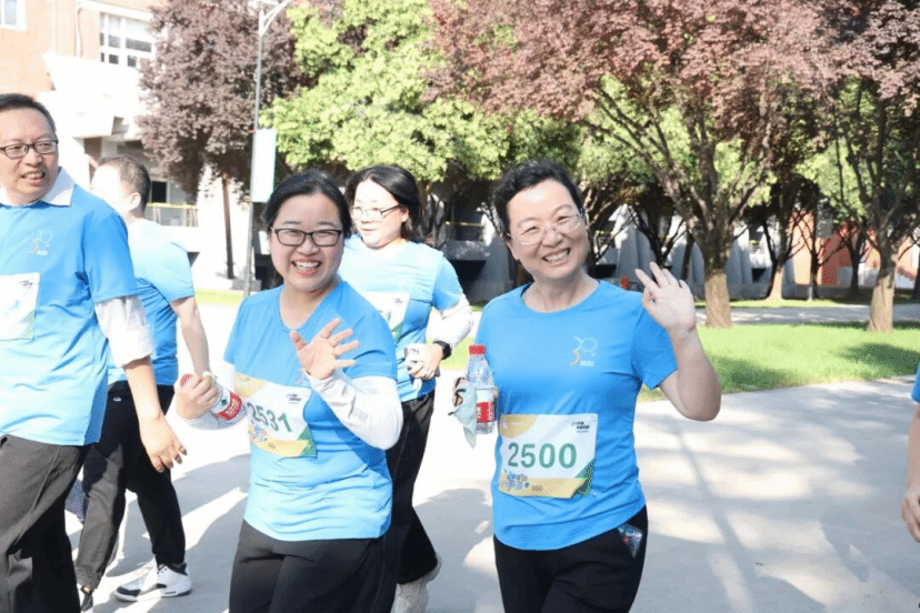16时,一声清脆的汽笛划破校园天际,拾光跑正式开跑!男、女教职工分批次按顺序踏上赛道,大家脸上洋溢着兴奋与期待。有的教职工并肩竞速,在奔跑中比拼速度与耐力;有的则选择匀速前行,一边感受微风拂面,一边欣赏沿途熟悉的校园景致。赛道沿途,蓝色的补给处、红色的医疗点清晰可见,志愿者们手持水杯、急救包时刻待命,用专业服务为参赛者保驾护航;多机位摄影师穿梭在赛道旁,用镜头精准捕捉着每一个奋力奔跑的身影、每一张绽放喜悦的笑脸。