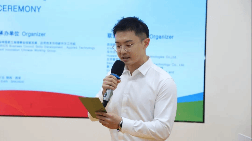 在全场注目下,“2025一带一路暨金砖国家技能发展与技术创新大赛”启动仪式正式拉开序幕。西安欧亚学院副校长张乐芳教授、华为云云学堂高校运营总监赵水清、华为云陕西生态总监张魁、西北工业大学周果清教授共同登台,将手掌轻按于启动台。随着全场齐声倒计时“5、4、3、2、1”响起,现场掌声如潮,“2025一带一路暨金砖国家技能发展与技术创新大赛”正式启航,一场汇聚创新与技能的竞技盛宴全面展开。