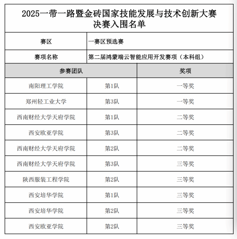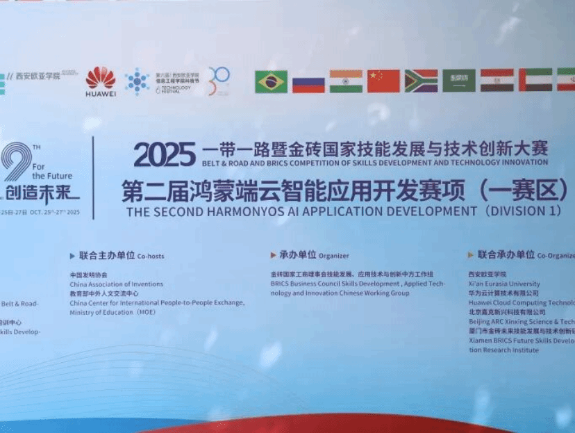 2025年10月25日至27日,由金砖国家工商理事会中方理事会、一带一路暨金砖国家技能发展国际联盟、中国科协一带一路暨金砖国家技能发展与技术创新培训中心等单位共同主办,中国发明协会、教育部中外人文交流中心联合主办,金砖国家工商理事会(技能发展、应用技术与创新中方工作组)承办,西安欧亚学院、华为云计算技术有限公司、北京嘉克新兴科技有限公司、厦门市金砖未来技能发展与技术创新研究院联合承办的“2025 一带一路暨金砖国家技能发展与技术创新大赛 —— 第二届鸿蒙端云智能应用开发赛项(一赛区)”,历经开幕式的隆重启幕与比赛的激烈角逐,最终在西安欧亚学院信息工程学院西区B栋二楼落下帷幕。