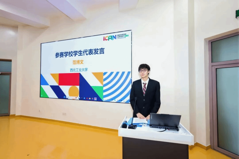 iCAN大赛西北赛区负责人、西北工业大学机电学院教授何洋介绍了西北赛区的赛事情况,并对iCAN大赛鼓励原始创新、培养创新人才的竞赛精神进行了深刻解读;西北工业大学学生范博文代表全体参赛选手发言。他让大家跟随一条“仿生鱼”潜入创新深海:凌晨四点的键盘声、零件散落的实验桌、赛程焦灼的对接现场……他用亲身经历讲述如何把“自信、坚持、梦想”六个字一点点敲进骨血,让在场师生听见青春与创意同频的心跳。