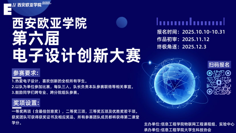 当电子元件的精妙在指尖跃动,当创新思维的火花于电路间碰撞,一场属于欧亚学子的电子设计盛宴正拉开帷幕!西安欧亚学院第六届电子设计创新大赛强势来袭,邀你共赴这场“奋进创新超越,智创电子未来”的科创征程!