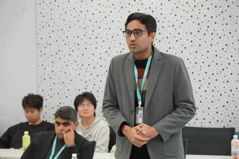 随后,外教老师Aki也做了精彩分享。他提到,不少同学中文基础扎实,但英语学习难度较大,还存在英语表达羞涩的情况。对此,Aki老师给出了几点核心建议:坚持,持续推进双语学习;好奇,遇到不理解的内容主动提问,向他人请教,从错误中积累经验;协作,与同学合作,借助团队力量共同进步。