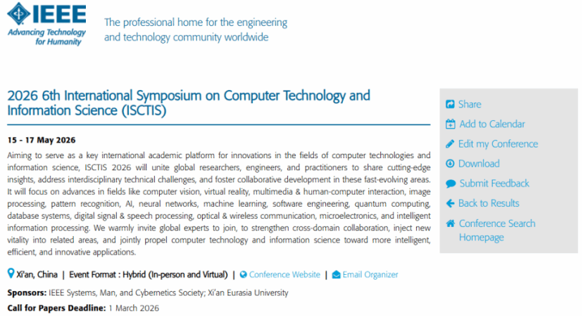 由西安欧亚学院主办的第六届计算机技术与信息科学国际研讨会(ISCTIS 2026)将于2026年5月15-17日在中国西安召开。本次会议聚焦“计算机技术”及“信息科学”领域的前沿研究与技术应用,旨在为全球高校、科研机构及企业专家搭建学术交流与产业协同平台,推动理论技术转化并促进跨领域合作。诚邀学术界与产业界同仁共聚西安,通过成果分享、技术研讨与资源对接,探索智能视觉技术发展新路径,共绘产学研融合创新蓝图。