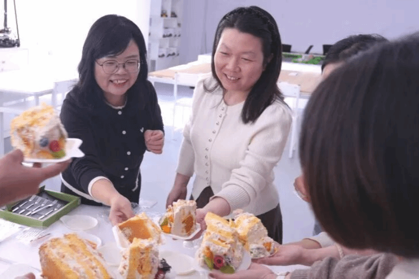 教室内装饰简洁而温馨,阳光透过卷帘洒下斑驳的树影,营造出宁静而治愈的氛围。桌上的水果蛋糕点缀着新鲜果粒,内部隐藏着芒果酱的惊喜;旁边整齐摆放的花酿芬芳护手霜礼盒,满含着学院对老师们的细致关怀。老师们笑意盈盈入场围坐,静候活动开始。