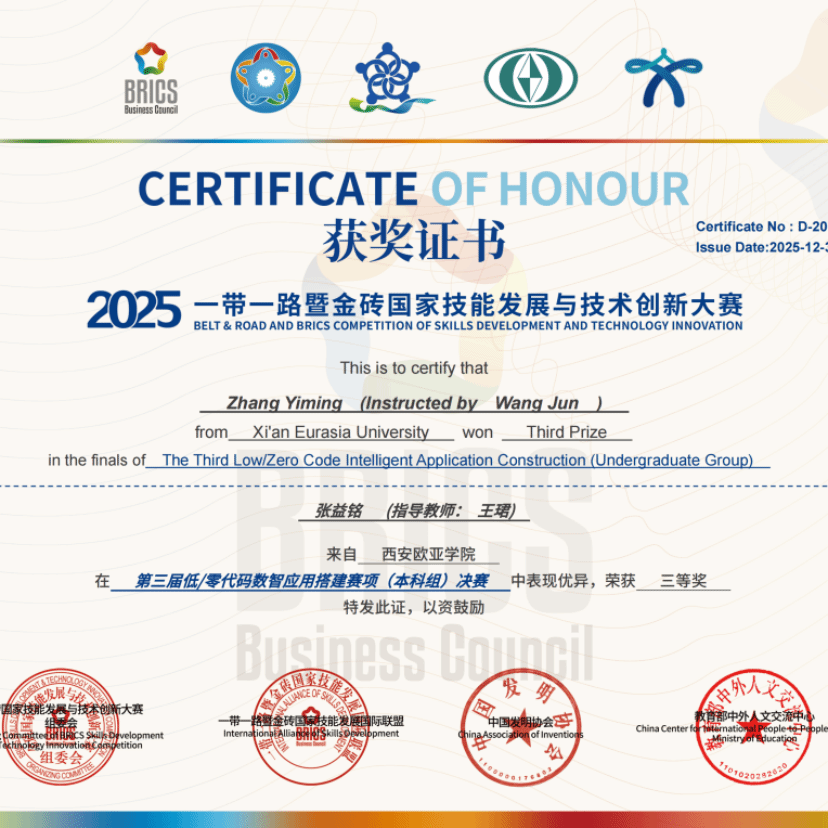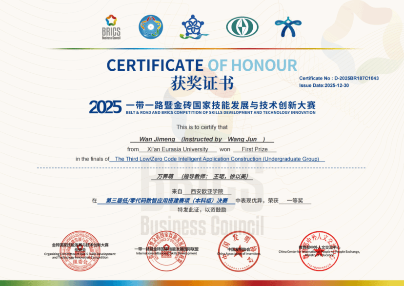 从三人协作到单人冲锋,变的是参赛形式,不变的是中外合作办学项目学子的硬核实力与奋进姿态!在“2025一带一路暨金砖国家技能发展与技术创新大赛之第三届低/零代码数智应用搭建赛项”中,项目学子突破团队赛模式限制,以个人赛全新挑战为契机,凭借扎实专业功底与灵活应变能力,在全国赛场强势突围,斩获1项国家一等奖、1项国家二等奖、5项国家三等奖、9项国家优秀奖的亮眼战绩!西安欧亚学院信息工程学院更以出色的组织统筹能力,一举拿下“最佳组织奖”与“优秀组织奖”双荣誉,用实力续写金砖赛事辉煌!