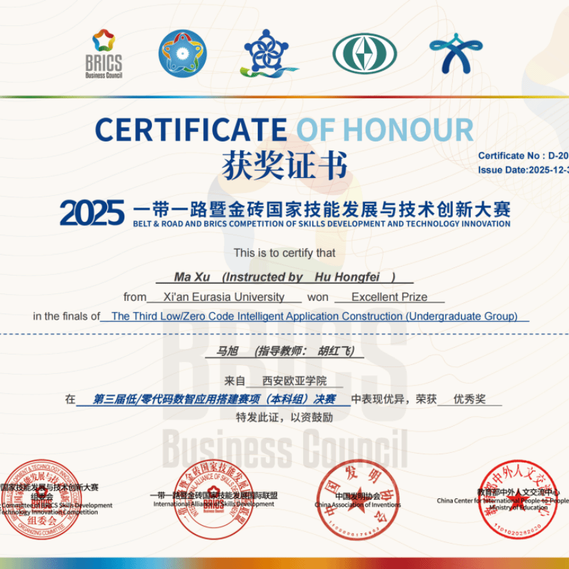 From 3-person teamwork to individual competition, what changed was the form of participation, while what remained unchanged was the solid strength and progressive attitude of the students from Chinese-foreign cooperative education programs! In the 3rd Low-Code/No-Code Digital & Intelligent Application Development Competition under the 2025 Belt and Road & BRICS Skills Development and Technology Innovation Competition, breaking away from the constraints of the team competition format, the students of the program seized the opportunity of the new challenge of individual competition. Relying on their solid professional foundation and flexible adaptability, they stood out prominently in the national competition and achieved an impressive record of 1 national first prize, 1 national second prize, 5 national third prizes and 9 national merit awards. Moreover, the School of Information Engineering of Xi’an Eurasia University, with its outstanding organizational and coordination capabilities, won both the Best Organization Award and Excellent Organization Award in one fell swoop, continuing the glory of the BRICS Skills Competition with its strength.