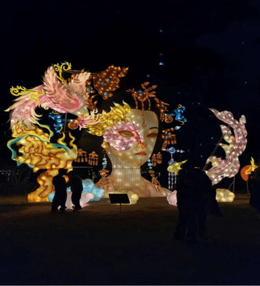 巨大的神女花灯在夜色中苏醒,凤羽流光,云纹流转。传统美学与现代光影碰撞,让东方神话在人间重焕华彩,每一缕光都诉说着千年的浪漫与想象。
