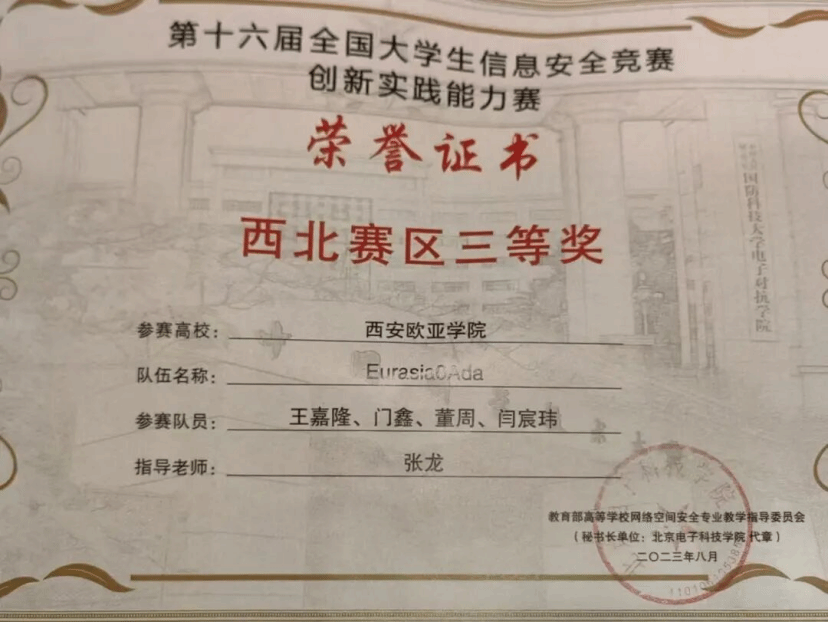 2023年,获全国大学生信息安全竞赛创新实践能力大赛西北赛区三等奖