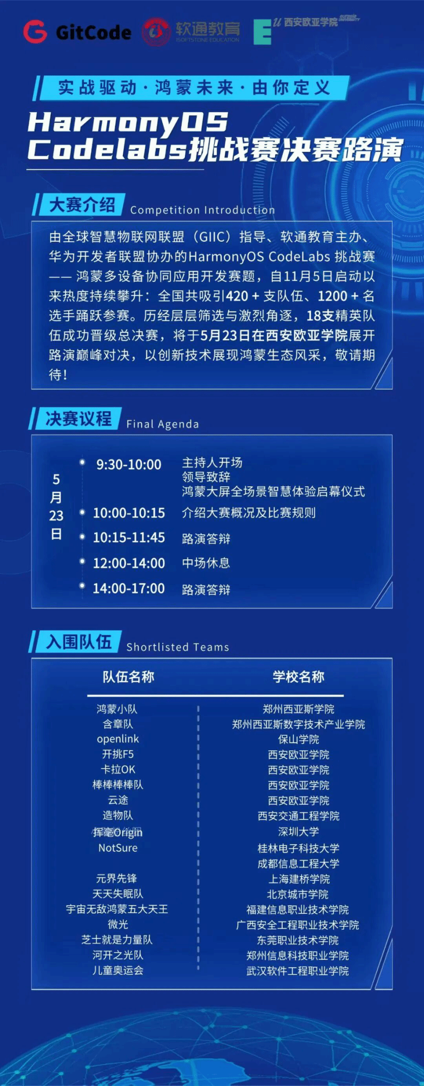 5月23日,HarmonyOS CodeLabs挑战赛决赛路演将在西安欧亚学院开启,18支晋级队伍同台竞技,共展鸿蒙应用开发创新成果。