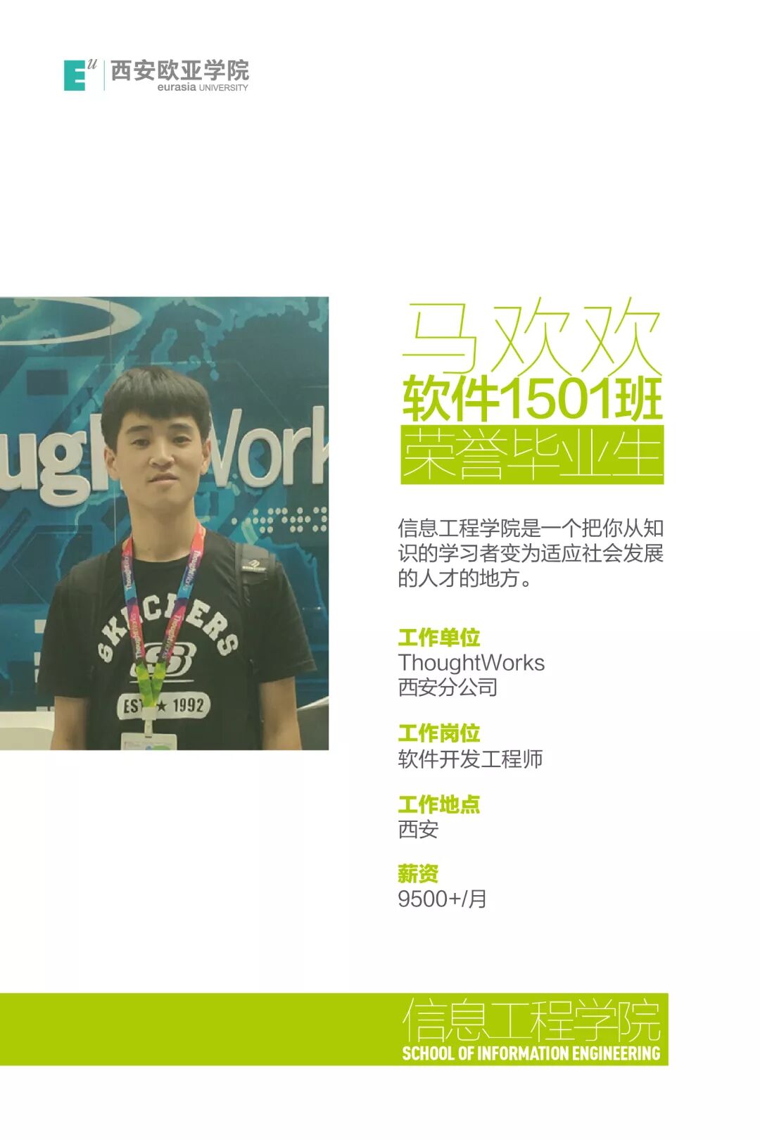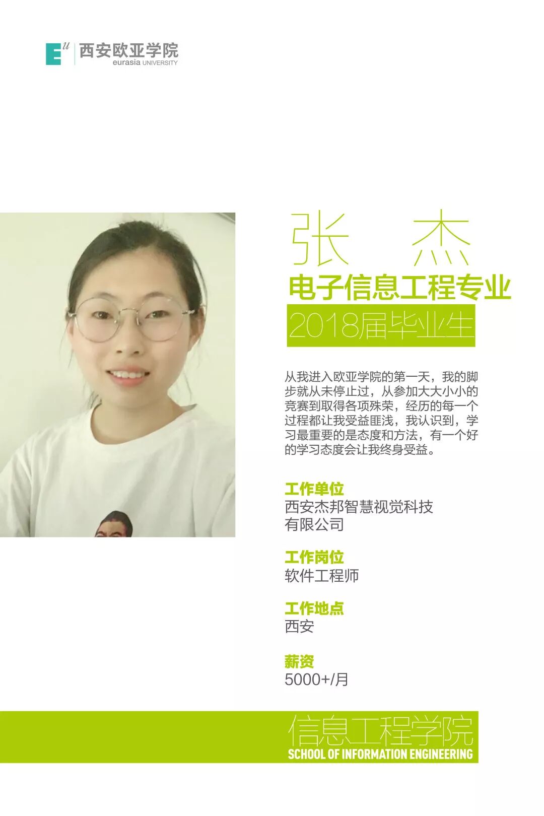 郭志强:“作为一名来自欧亚学院的西电研究生,从考研到入学,再到入职阿里的每一步都非常艰辛。请展现出你的自信,用双手和智慧来开创我们美好的未来”。