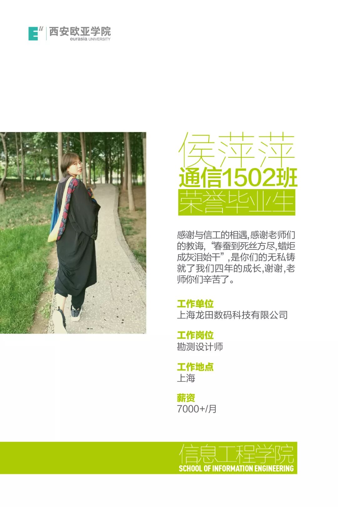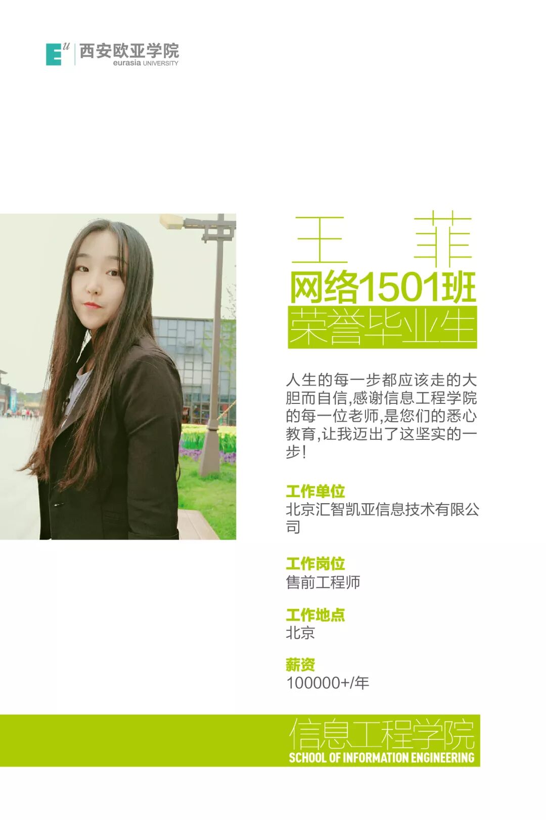 王菲:人生的每一步都应该走的大胆而自信,感谢信息工程学院的每一位老师,是您们的悉心教育,让我迈出了这坚实的一步!