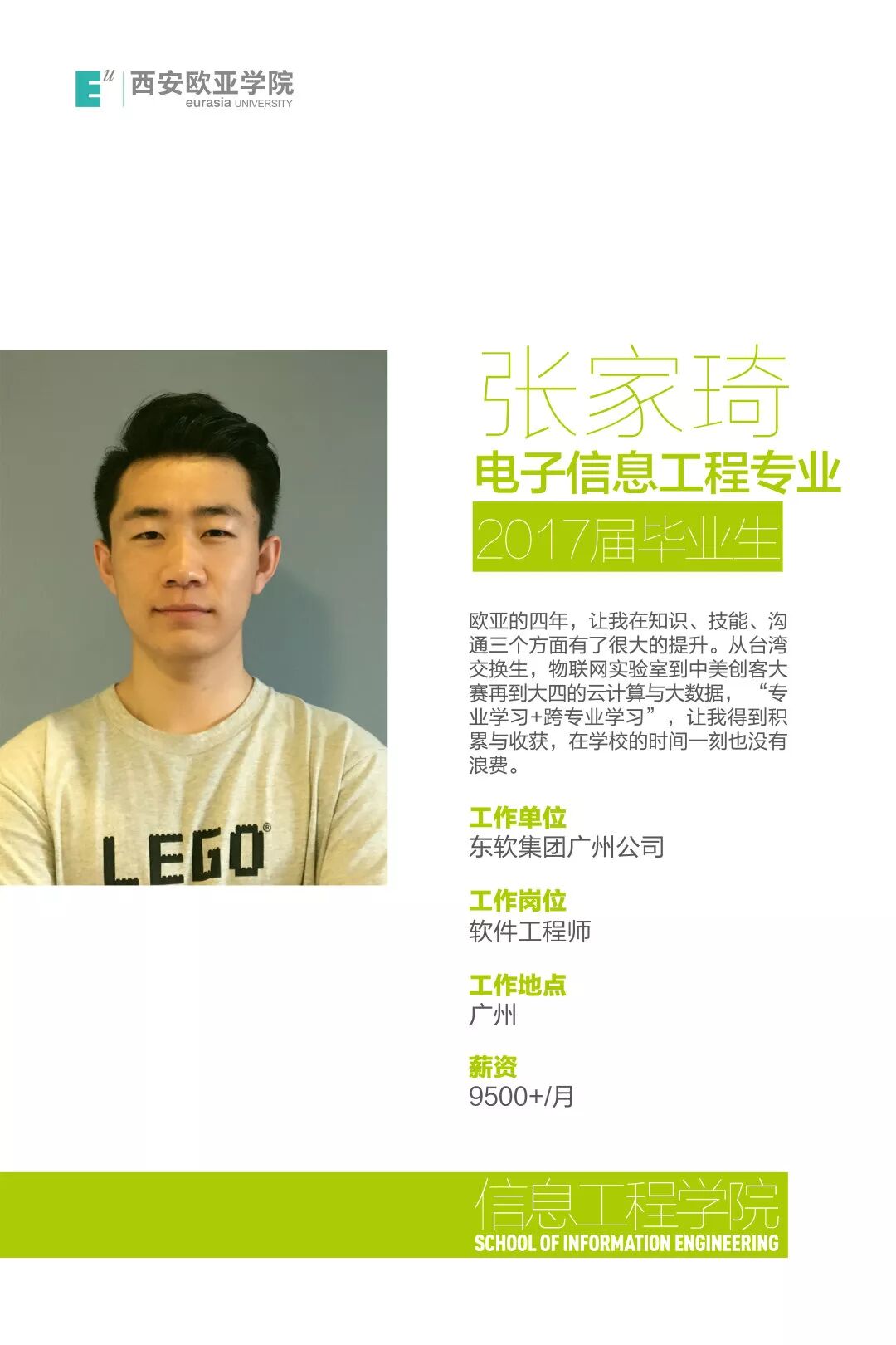 张家琦:欧亚的四年,让我在知识、技能、沟通三个方面有了很大的提升。从台湾交换生,物联网实验室到中美创客大赛再到大四的云计算与大数据,“专业学习+跨专业学习”,让我得到积累与收获,在学校的时间一刻也没有浪费。