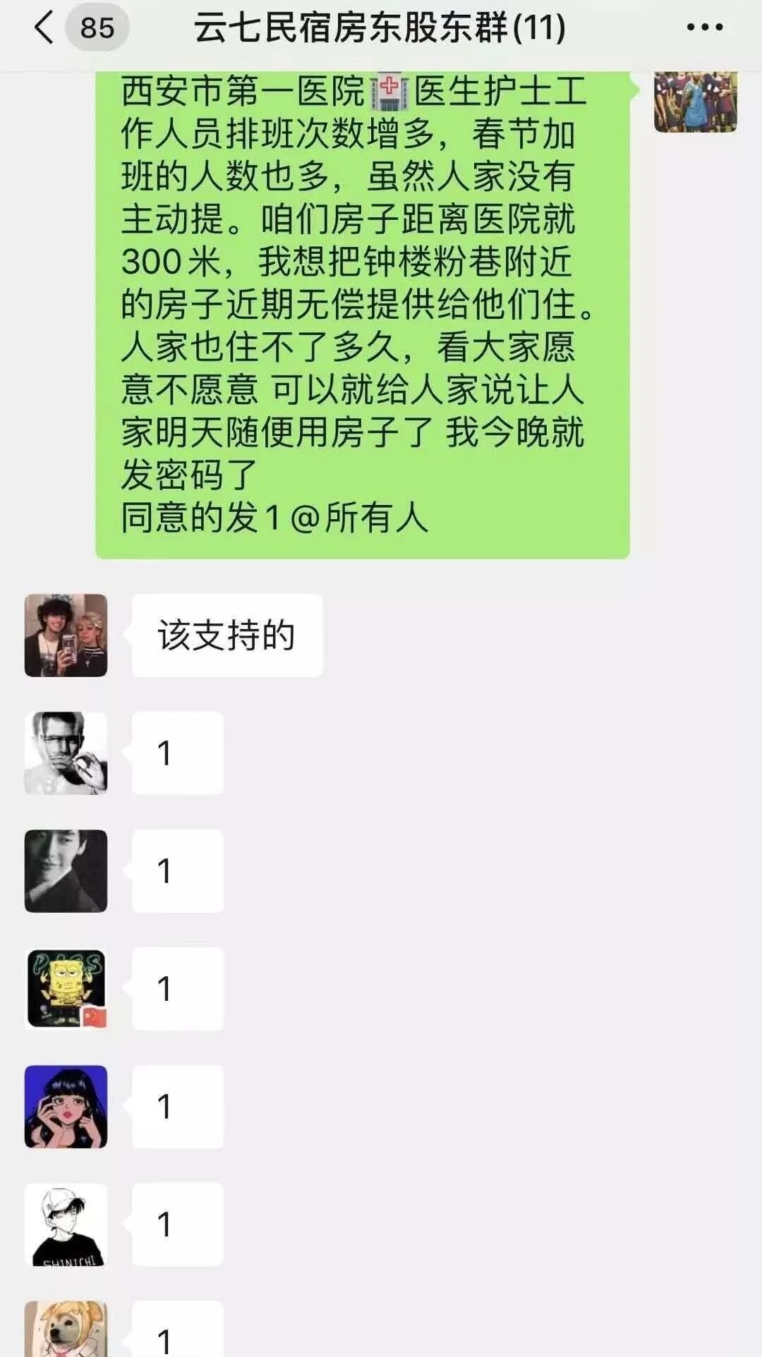 在这期间,张靖炜了解到西安市第一医院的医护人员春节期间都在加班开展防“疫”工作,因政府加强对出行的管控,给那些离家远、轮班频次高的医护人员带来极大不便,没有过多考虑张靖炜便做出了一个决定——将自己的民宿免费提供给医护人员。除此之外,他还联系到周边民宿的房东利用房源的位置优势,自愿为西安市第一医院的医护人员提供干净、独立的免费房源。他说:“医护人员是守护我们的天使,这一次,让我们也来守护他们”。