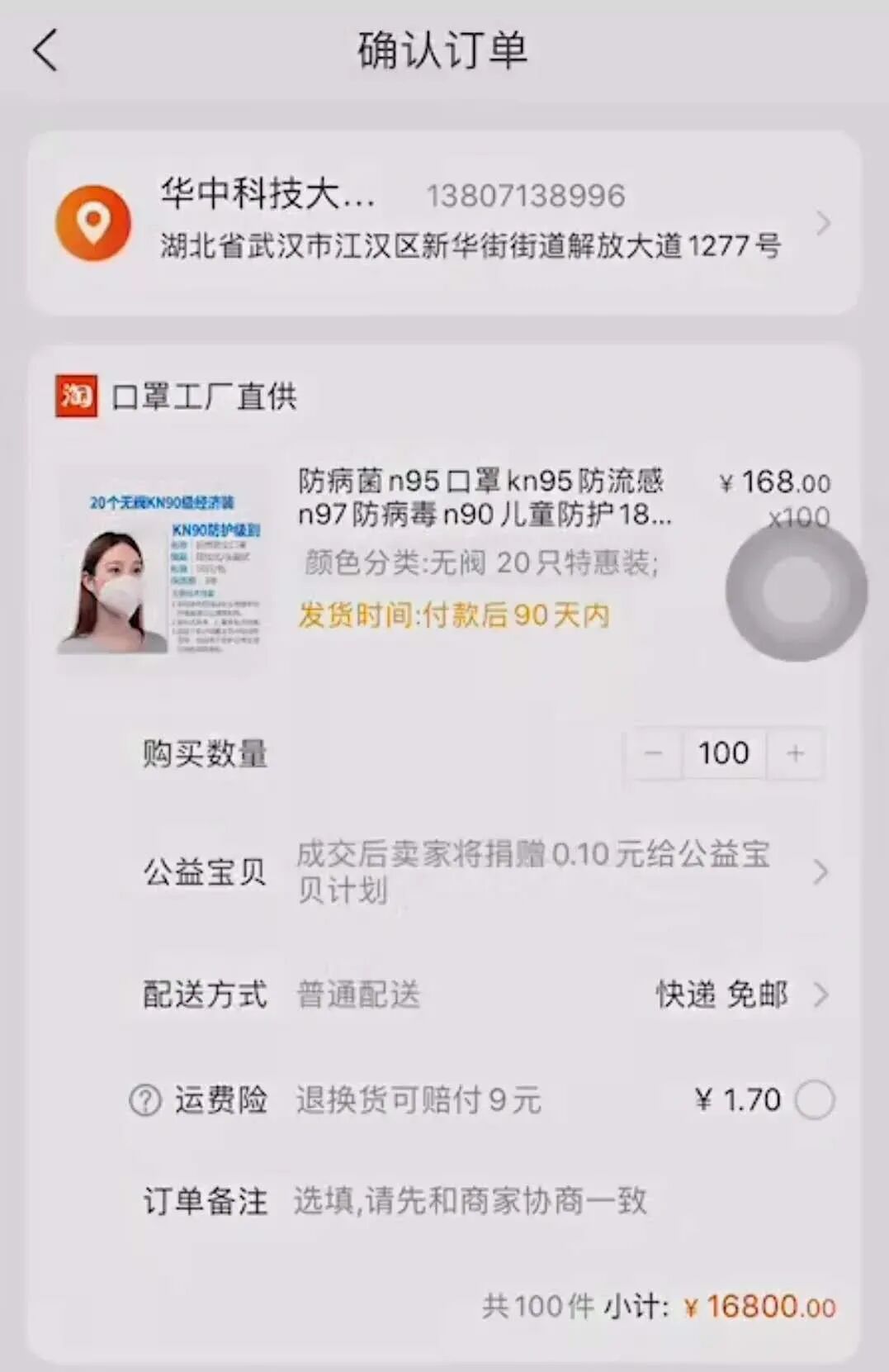不止如此,在微博上看到武汉协和医院医护人员发布的物资求助信息后,张靖炜又与同学共同集资并加上收到医护人员转账的7000元感谢房费,多方途径筹募物资,最后向武汉协和医院捐献了4000只口罩。“当时我们的口罩购买极其艰难,基本没有购买途径,好不容易接到订单的厂家一时半会儿也不能生产出来,但是后来听说我们是捐给武汉的,厂家不仅把我们的订单提前,而且原本26800元的费用,只收取了19800元。”