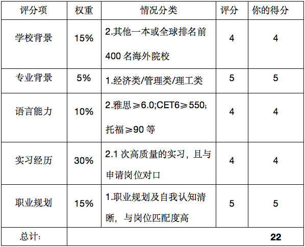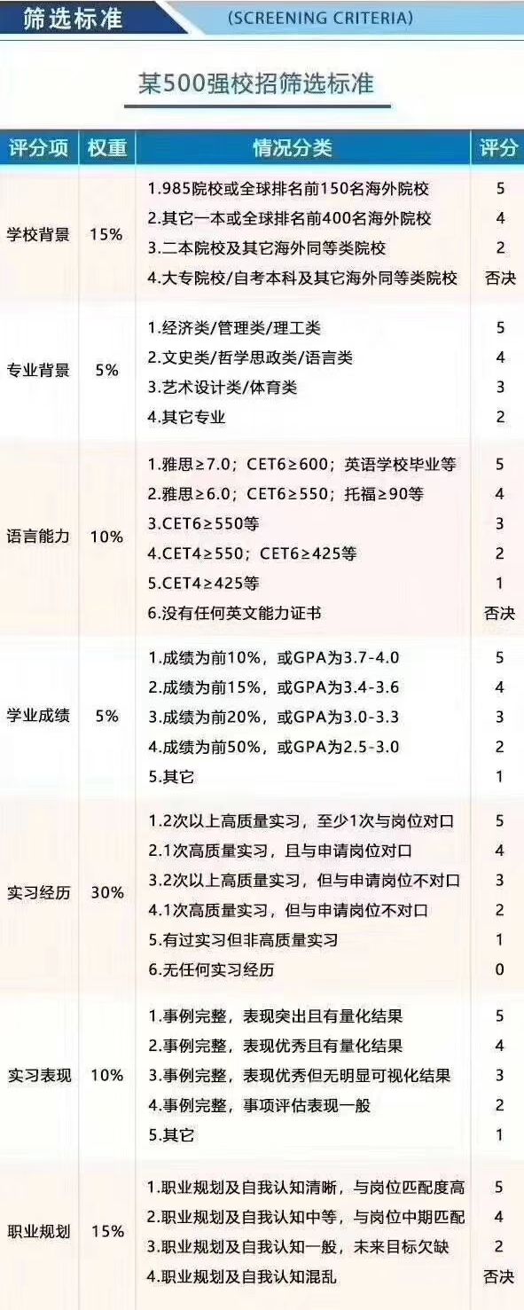 是不是很绝望?占比最高的两项就已经很难达到了,即使你全占了也不意味着你就能被录取,还有其他综合评分项影响总成绩。这也就意味着,纵使你毕业985、211世界名校,有着非常优秀的实习经历,依然会被世界500强的企业淘汰。